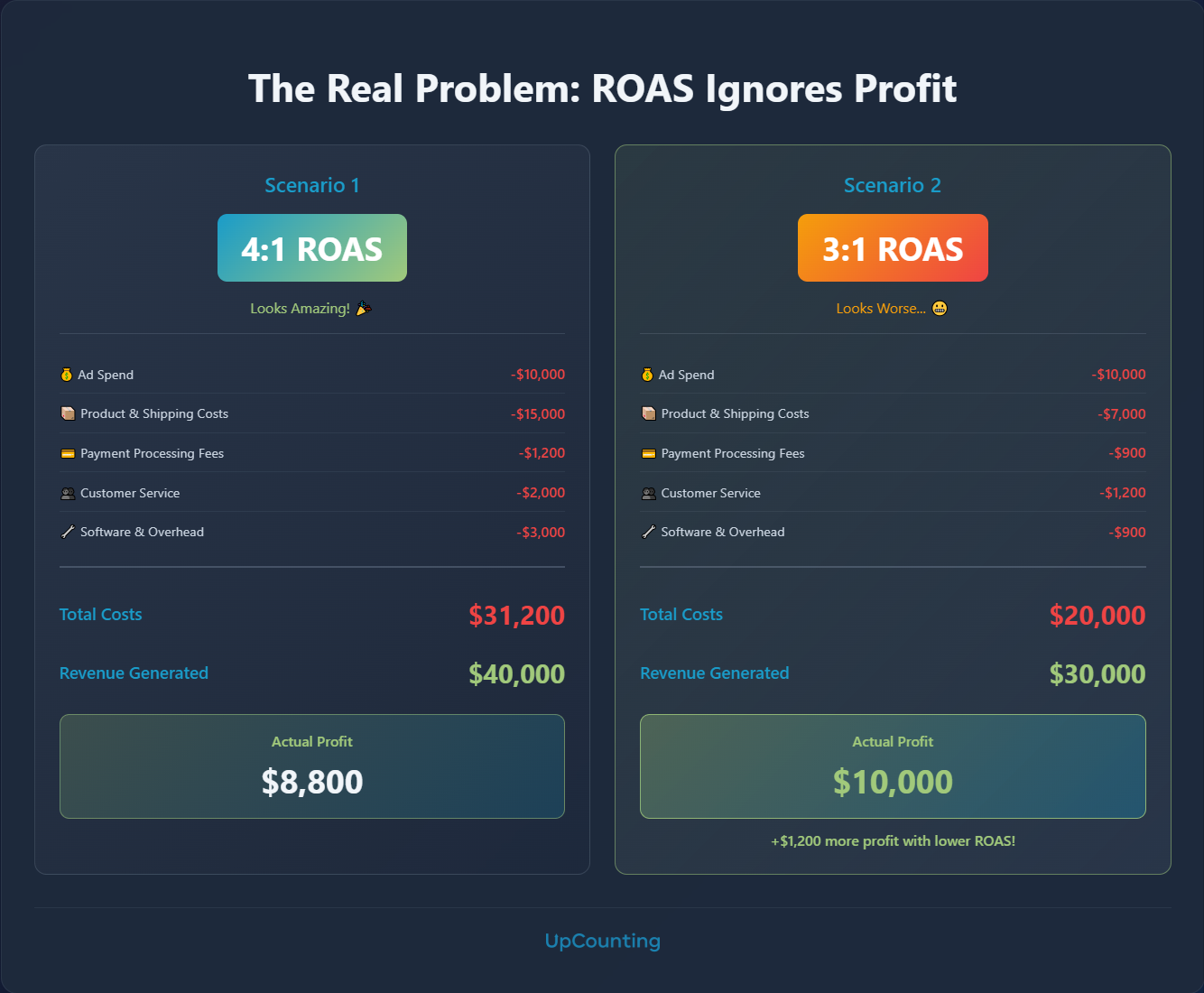 You just spent $31,200 to make $40,000. Your actual profit? $8,800. Not bad, but nowhere near the "4x return" ROAS suggested.